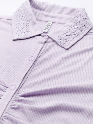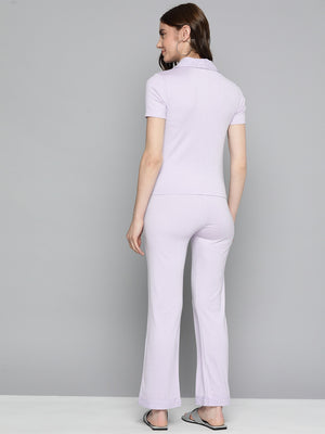"Experience elegant comfort with Sharfia's Lavender Lace Lounge Coord Set. This sophisticated two-piece ensemble features a ruched button-up top with delicate lace collar detailing paired with perfectly matched straight-leg pants.