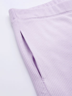 The set is crafted in a soothing lavender hue with premium ribbed fabric that offers both style and comfort. The top's feminine ruching detail and short sleeves create a flattering silhouette, while the pants feature a comfortable elastic waistband and charming lace trim hem.