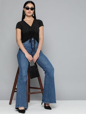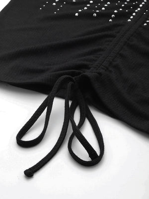 "Make a statement in Sharfia's Midnight Rain Ruched Top. This sophisticated black crop top showcases cascading rhinestone streams against a rich noir background.
