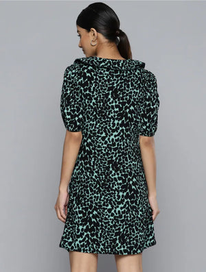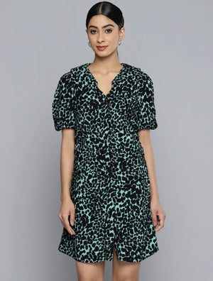 "Make a statement at your next soirée with Sharfia's Mint Leopard Luxe Party Dress. This head-turning piece features a modern twist on classic animal print, combining bold black patterns with refreshing mint green hues.