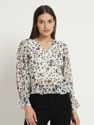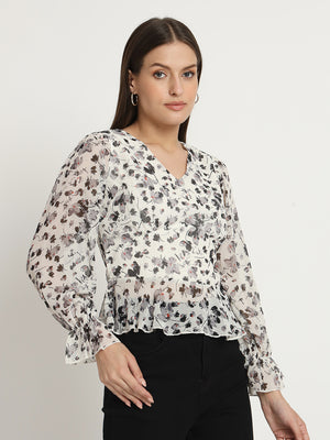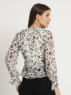 "Experience ethereal elegance with Sharfia's Monochrome Meadow Peplum Top. This sophisticated piece features a delicate floral print in grayscale tones with subtle coral accents on a crisp white background.