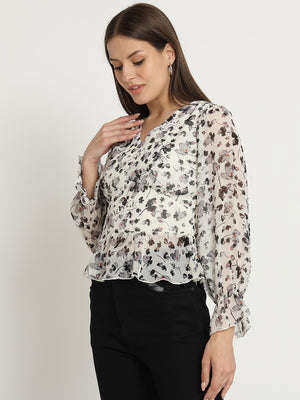The romantic design showcases a flattering V-neckline, billowy sleeves with dainty ruffled cuffs, and a feminine peplum hem that creates a graceful silhouette. Crafted from airy chiffon, this top embodies both elegance and modern style.