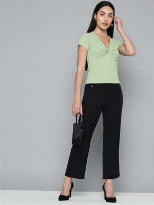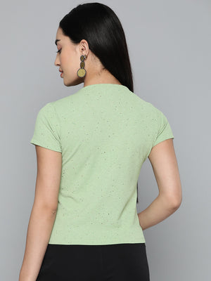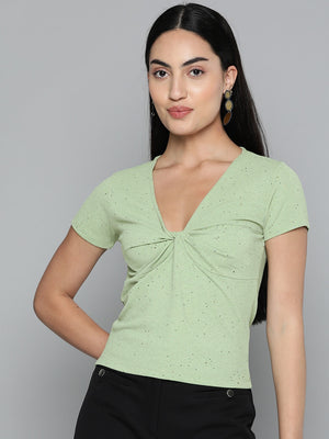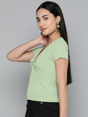 "Elevate your wardrobe with Sharfia's Pistachio Sparkle Twist-Front Top. This charming piece features a soft mint green base adorned with delicate black speckles, creating a subtle shimmer effect.