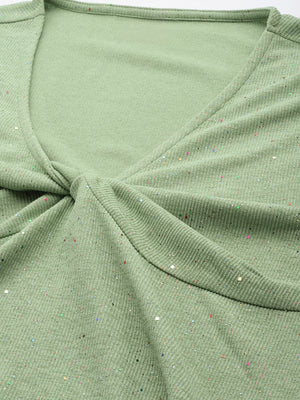 This versatile piece transitions effortlessly from day to night. Pair with high-waisted trousers for a polished office look, or style with your favorite jeans for a chic casual ensemble. The unique mint green shade and sparkle detail make this top a standout piece for any occasion."