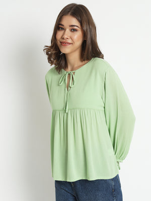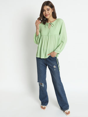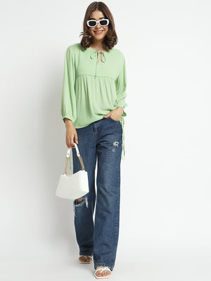 This versatile piece works beautifully for both casual and semi-formal occasions. Pair with your favorite jeans for an elevated everyday look, or dress it up with tailored pants for office wear. The soothing sage green color and romantic silhouette make it a perfect addition to your spring-summer wardrobe."