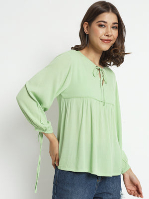 Embrace romantic elegance with Sharfia's Sage Whisper Peasant Top. This ethereal piece features a dreamy mint green hue in flowing crepe fabric that embodies both comfort and style.